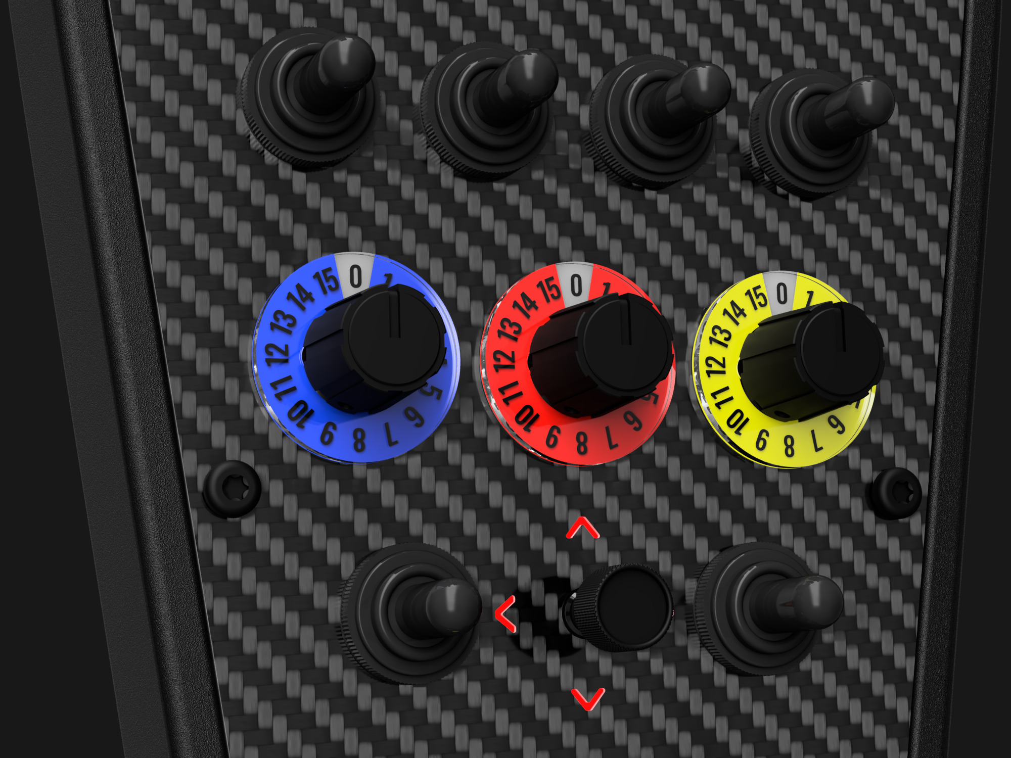 Featuring 42 individual inputs. This button box console provides a variety of styles of inputs such as: 1x 7-way switch, 4x rotary encoders, 13x toggles and more.